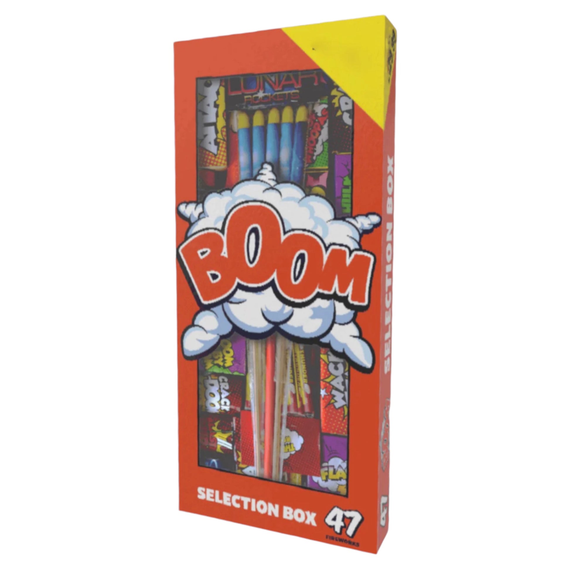Set the sky on fire with this electrifying Big Boom Selection Box! Enjoy rockets, barrages, fountains and more. Watch the black backdrop light up to luminous effect. Containing 47 fireworks, this mother of a box is sure to make your night go out with a bang!