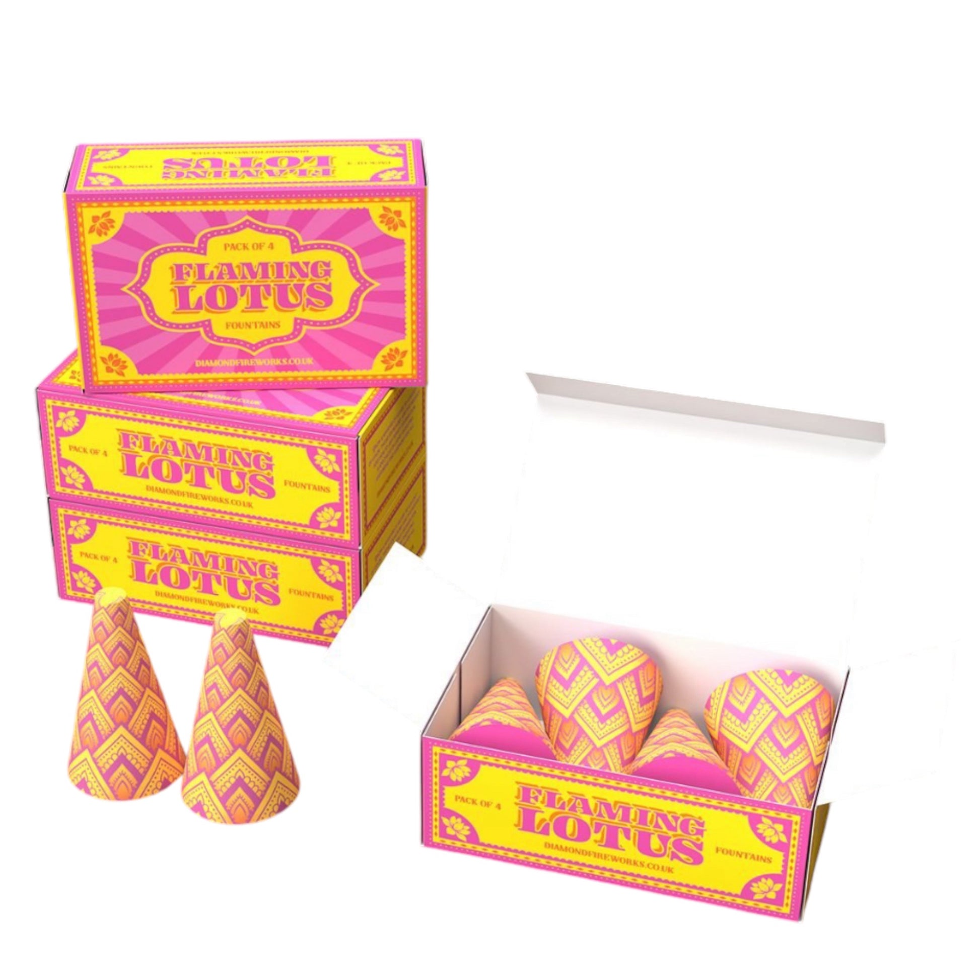 Flaming Lotus offers a 4-pack of 3" fountains, each blooming with fiery effects and vibrant colors like the petals of a lotus flower!