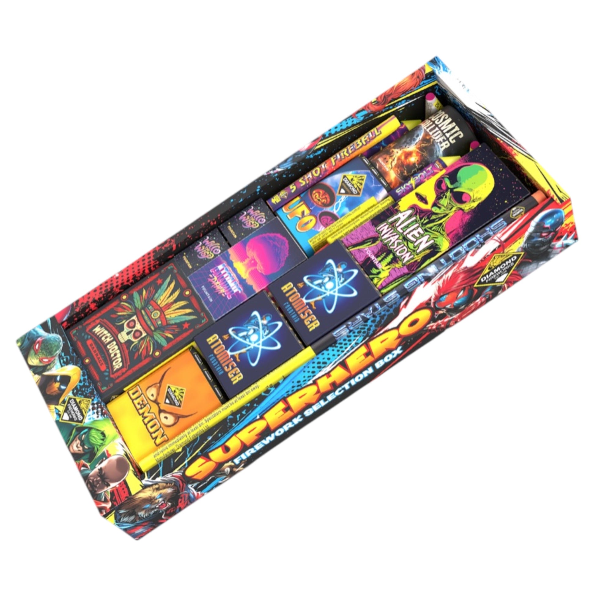 Make an impact with mighty Super Heroes selection box! Equipped with a range of barrages, fountains and rockets this box will fill the sky at an affordable price.